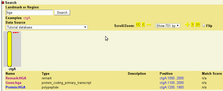 To see how GBrowse searches for names, type "HGA" (either upper or lowercase) in the search textbox and press "Search." Because the search term matches three remark whose unqualified name is HGA, GBrowse will bring up the region between 1000..2000 and highlight the HGA remark.